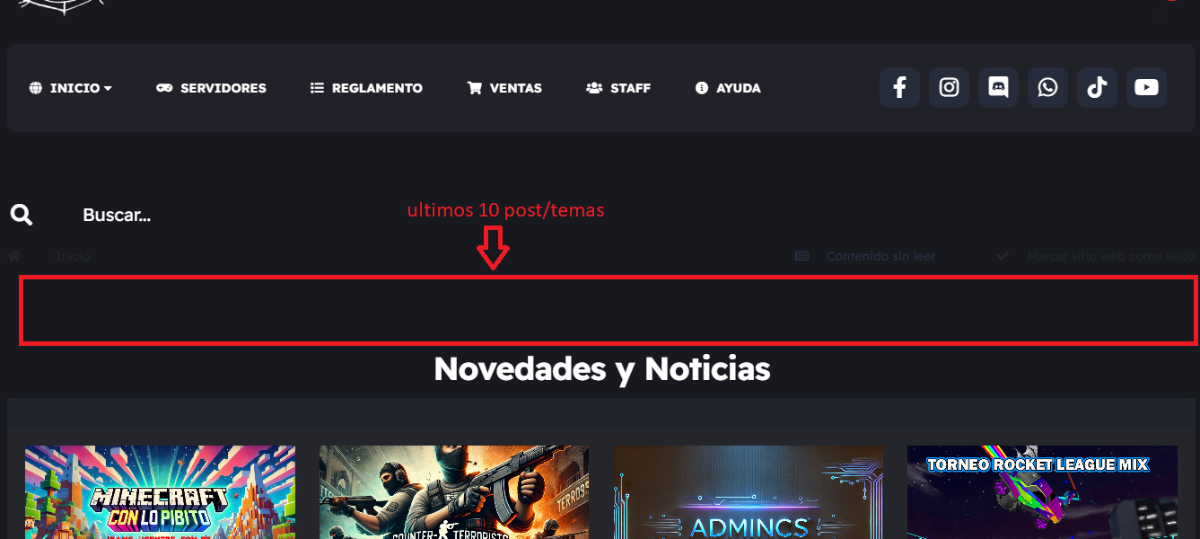 Tano Publicado el 21 de Marzo, 2025 Compartir Publicado el 21 de Marzo, 2025 (editado) Buenas, mi sugerencia es agregar un apartado en el inicio de la pagina (Wgamers.com.ar) donde aparezcan los últimos 10 o 15 post recientes, seria mas util ver que es publico y habria mas actividad en el foro, porque la verdad no se donde tenes que entrar para ver los post mas recientes, estaria bueno agregarlo apenas estes en la pagina de inicio tipo en este espacio Creo uqe la gente se entaria mejor, cuando hay un sorteo o futuros torneo o incluso apoyen sugerencias. algo asi pdoria ser, temas recientes, digo Editado el 21 de Marzo, 2025 por Tano 1 Citar Enlace al comentario Compartir en otros sitios Mas opciones de compartir...