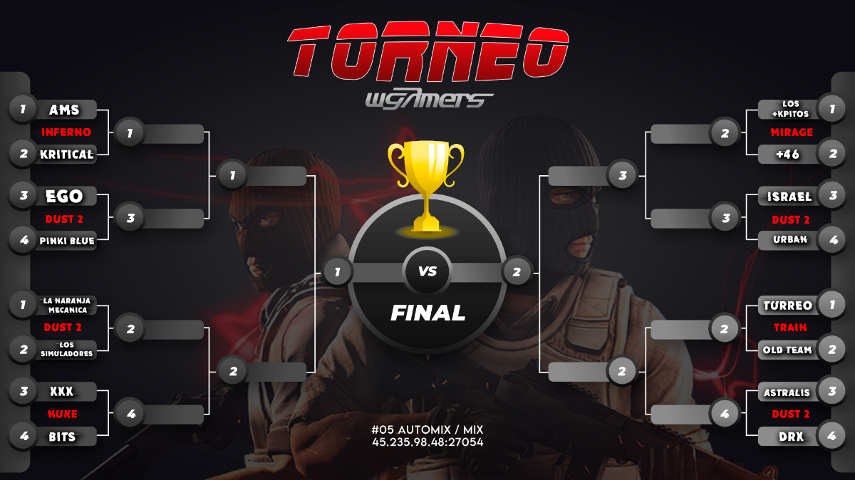 Matteo-. Publicado el 14 de Abril, 2025 Compartir Publicado el 14 de Abril, 2025 ¡EVENTO MIX 5 VS 5 OCTAVOS DE FINAL! ¡Buenas a todos!, nos complace traerles los cruces para los octavos de final y sus respectivos horarios. PAUTAS Les daremos 10 minutos a los equipos para que se presenten en el horario pactado. Al team que le falte 1 integrante hasta después del tiempo acordado, deberá jugar con uno menos y el jugador faltante o un suplente podrá ingresar nuevamente (cuando el equipo solicite /pausa únicamente) El server contará con el grabado automático de DEMO para cada jugador. En caso de que el STAFF requiera dicho material, será OBLIGATORIO que el player cuente con la misma, si no lo hace quedarán descalificados SIN EXCEPCIÓN. En caso de que falten dos jugadores o más de un equipo respetando el tiempo acordado, el mismo quedará descalificado (no se tolera la falta de compromiso y responsabilidad de los usuarios anotados). No se permite quitear en medio de la partida sin alguna razón que lo justifique. STAFF WGAMERS 2 3 1 1 1 Citar Enlace al comentario Compartir en otros sitios Mas opciones de compartir...