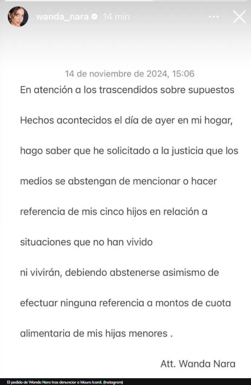 “En atención a los trascendidos sobre supuestos hechos acontecidos el día de ayer en mi hogar, hago saber que he solicitado a la Justicia que los medios se abstengan de mencionar o hacer referencia de mis cinco hijos en relación a situaciones que no han vivido ni vivirán, debiendo abstenerse asimismo de efectuar ninguna referencia a montos de cuota alimentaria de mis hijas menores”, pidió la mediática en una historia de Instagram.